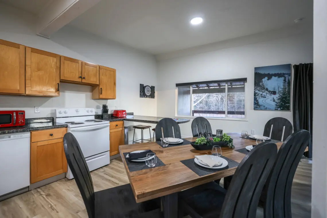 Enjoy a warm and inviting space designed for relaxation and convenience. Stay connected with Wi-Fi, catch your favorite shows on the living room TV, or gather around the spacious 6-person dining table for meals and memories. The kitchen counter features two bar stools, perfect for casual dining or morning coffee chats.